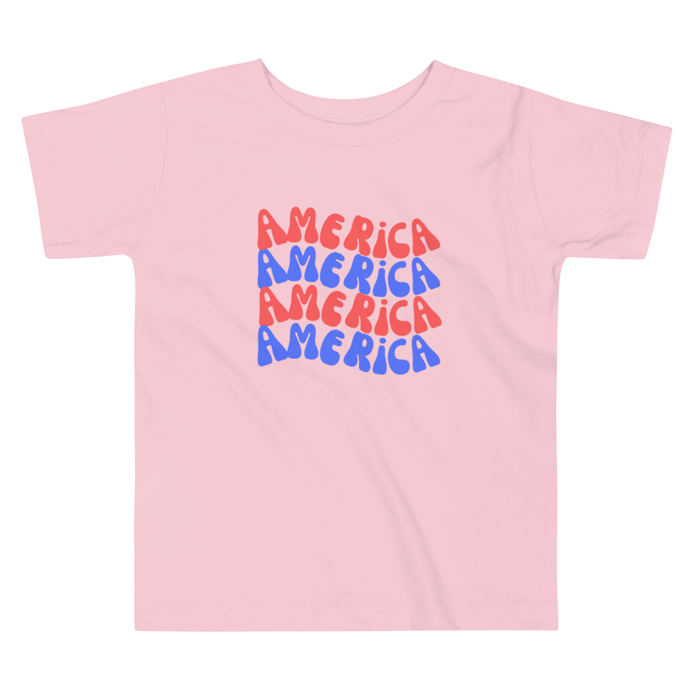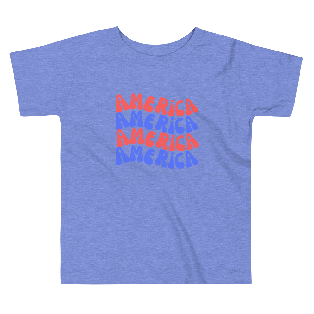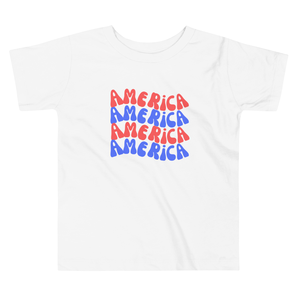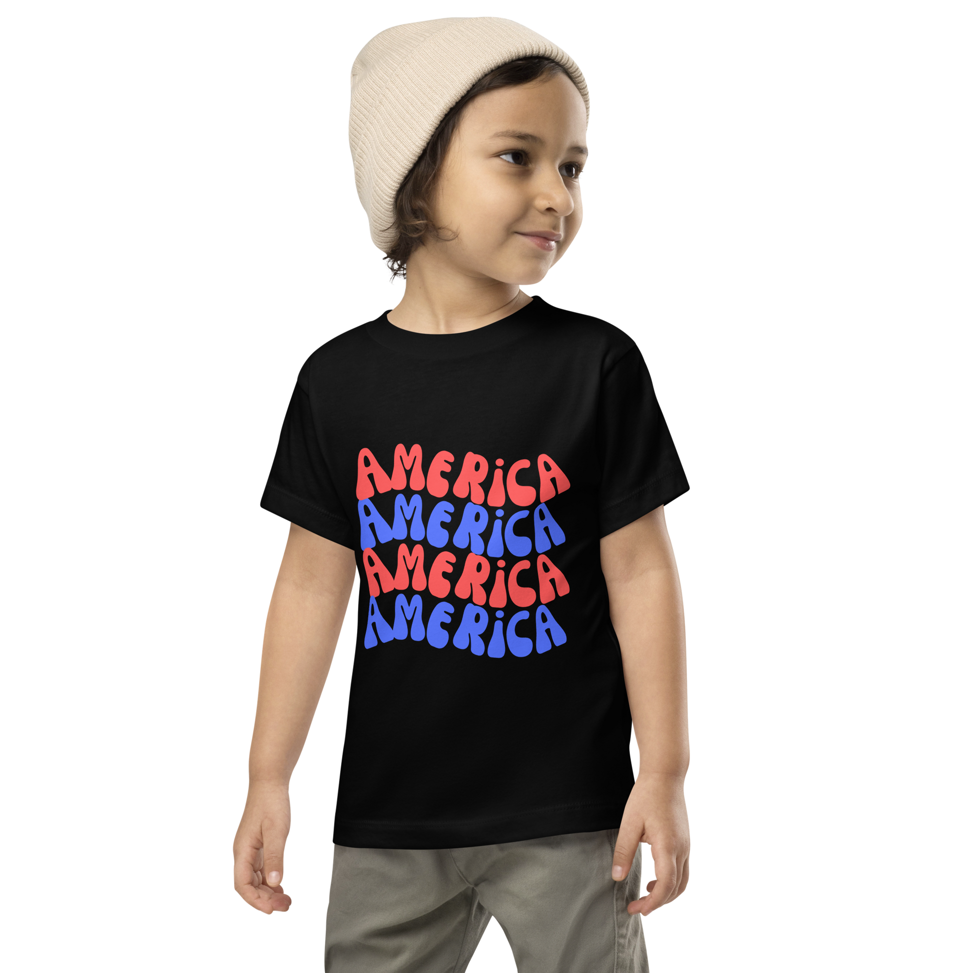 Introducing our "America" Fourth of July Toddler T-Shirt from our exclusive collection. Let your toddler shine with patriotic pride, feeling super comfy and looking extra stylish in this short-sleeve jersey tee. Crafted from 100% combed and ring-spun cotton, this t-shirt guarantees exceptional softness and durability for your little one.