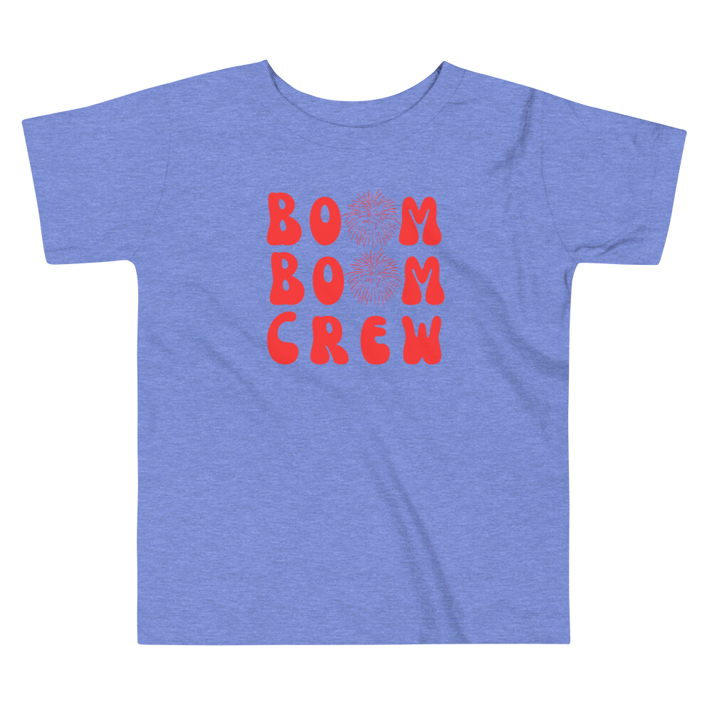 Let your toddler make a statement this Fourth of July with our "Boom Boom Crew" Toddler T-Shirt. Combining comfort, style, and a unique print, it is destined to become a favorite in your child's wardrobe. Order now and let your little one join the boom boom crew in style!"